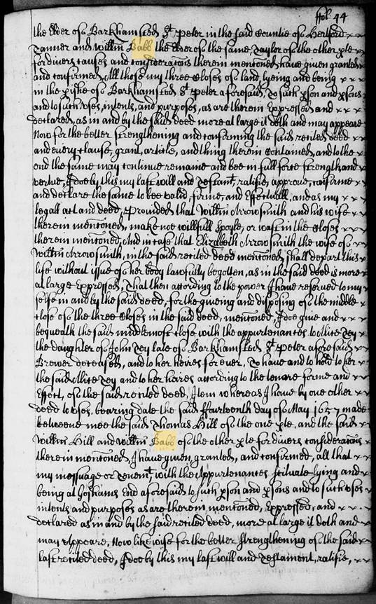 Imprimis whereas I the said Thomas Hill by a deed to bessos bearing date the ffourteenth day of may in the years of our Lord one thousdand six hundred ffiftie and Seamon made between mee the said Thomas Hill of the one side and William Hill the Elder of Barkhamsted St Peter in the said countie of Herford Tanner and William Babb the Elder of the same, Taylor of the other side fordinois tansos and considerations therein mentioned have given granted and confirmed, All those my three closes of land lyeing and being in the Parish of Barkhamsted St Peter aforesaid, to such person and persons and to such persons, intents, and purposes, as are therein expressed and declared, as in and by the said deed more at large it doth and may appeare now for the better strengthening and confirming the said recited deed and every thanke, grant, entitile, and thing therein contained, and to the ond the same may tonlinue remaine and bee in full force strength, and berhid, I doe by this my last will and testament, ratifie, approve, confirme and declare the same to be valid, firme, and Effortuall, and as my legal act and deed, provided that William Arrowsmith and his wife therein mentioned, and in case that Elizabeth Arrowsmith the wife of William Arrowsmith, in the said recited deed mentioned, shall depart this life without issue of her body lawfully begotten, as in the said deed is more at large expressed, that then according to the power, I have referred to my selfe of the three closes in the said deed, mentioned, I doe give and bequeath the said widow of those with the appurtenances to Alice Coy the daughter of John Coy of Barkhamsted St Peter aforesaid Brewer deceased, and to her heires forever, to have and to hold to her the said Alice Coy and to her heires according to the law reforme and efforts, of the said recited deed,