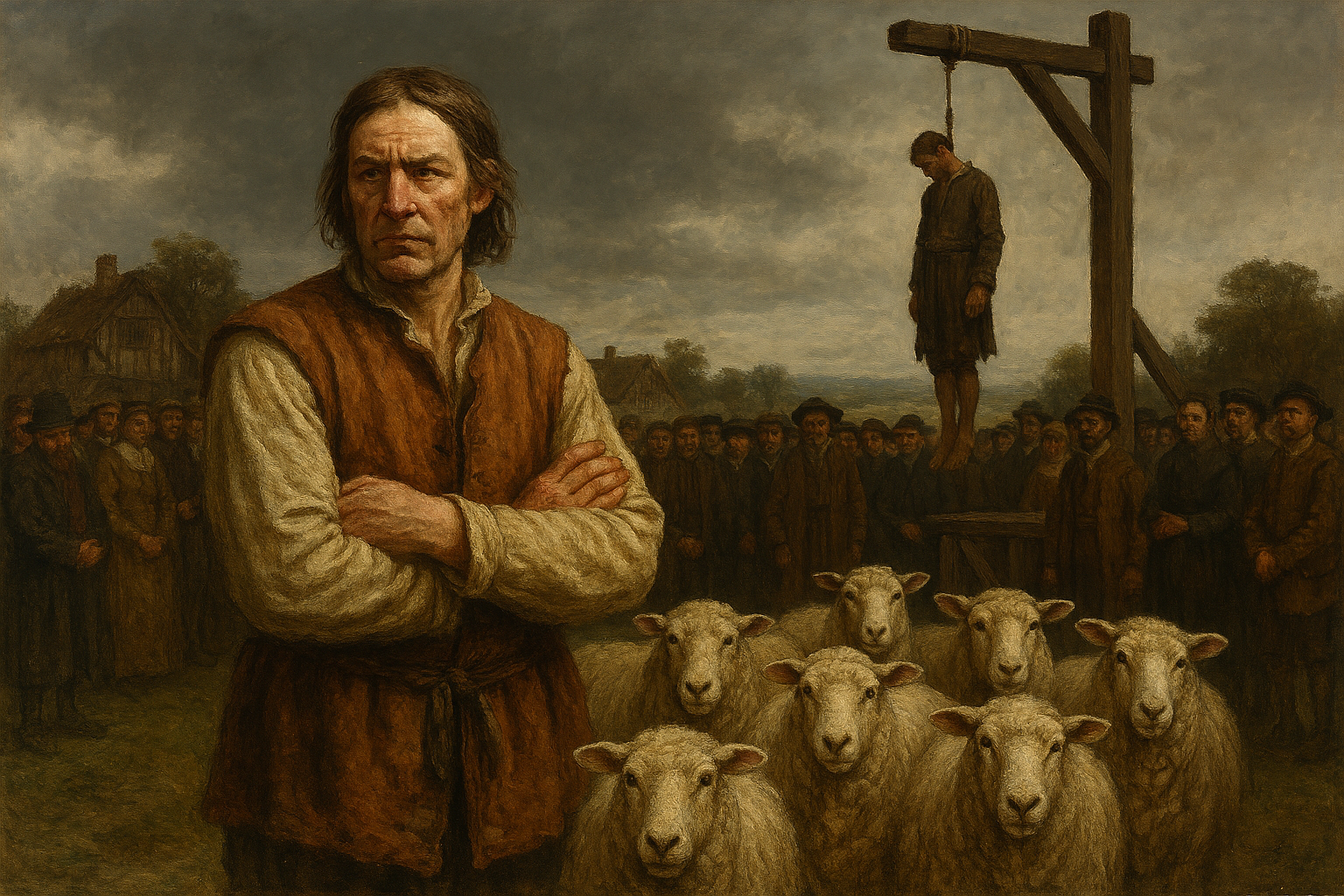 The gallows stood stark against the summer sky, a grim silhouette on the edge of town. Among the crowd gathered to witness the execution was John Babbe, his wool-stained hands clenched at his sides.